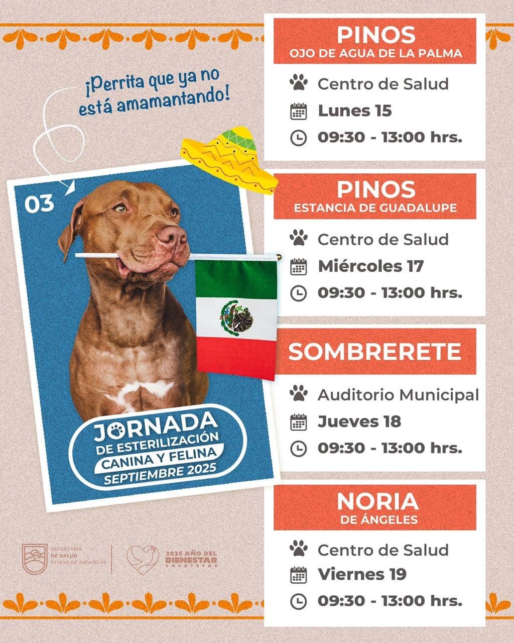 La Brigada Permanente de Esterilización Canina y Felina llegará el 15 de septiembre a la comunidad de Ojo de Agua de la Palma, mientras que el miércoles 17 arribará a Estancia de Guadalupe, ambas pertenecientes al municipio de Pinos.