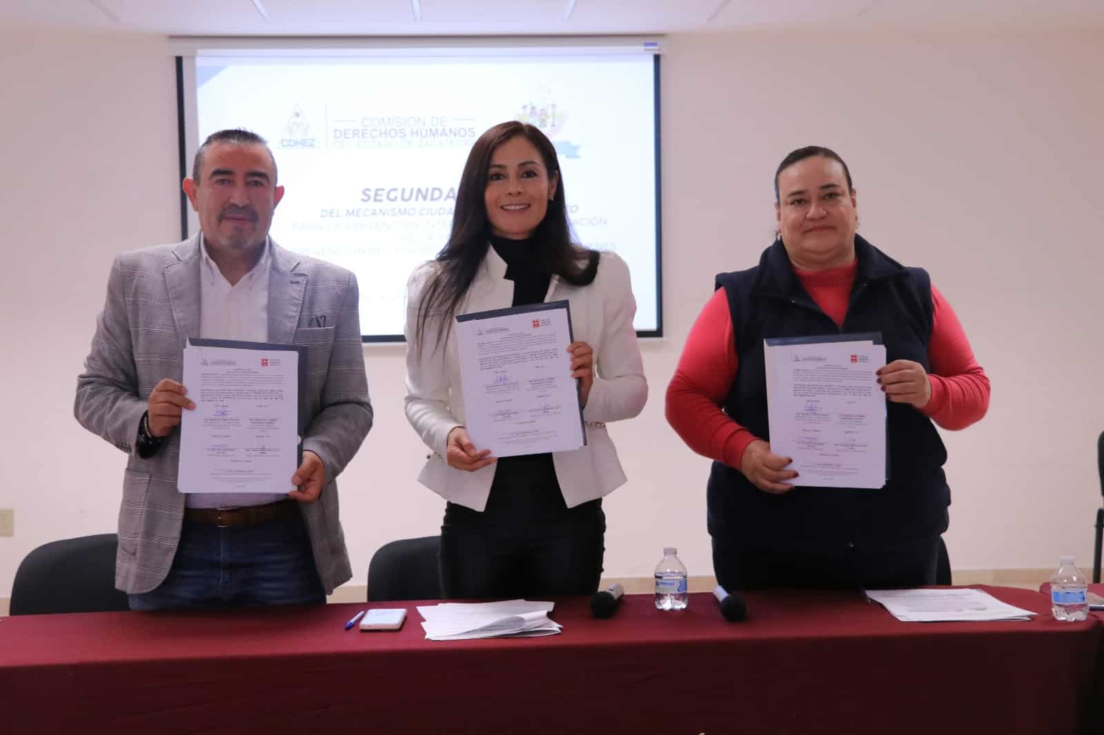 Zacatecas, Zac.- En el marco de la Segunda Sesión del Mecanismo Ciudadano de Monitoreo para la Prevención, Intervención y Erradicación de la Violencia y Prevención del Suicidio en Adolescentes y Jóvenes, la Comisión de Derechos Humanos del Estado de Zacatecas (CDHEZ) y el Centro de Integración Juvenil, A.C., firmaron un Convenio de Colaboración con el propósito de fortalecer acciones conjuntas enfocadas en la prevención de las adicciones y la promoción de la salud mental.