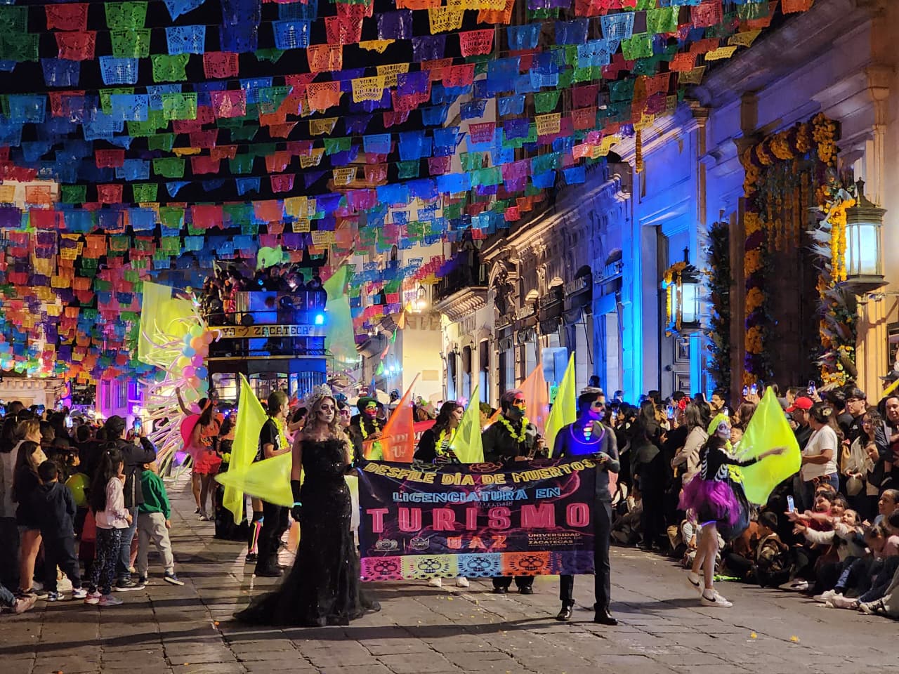 Zacatecas, Zac.- Con un gran contingente, la Universidad Autónoma de Zacatecas (UAZ) participó en el tradicional Desfile de Día de Muertos, que recorrió las principales calles del Centro Histórico, reafirmando su compromiso con la preservación de las tradiciones mexicanas y la promoción del arte y la cultura.