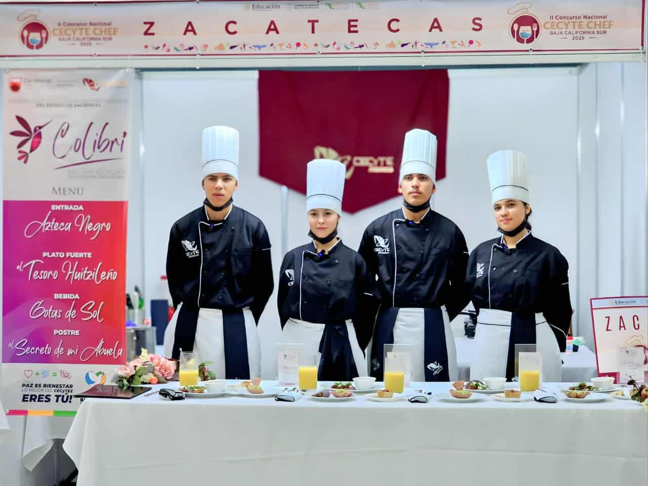 Las jóvenes Nataly Ixel Núñez y Roselyn Carranza Reyes, así como los alumnos Omar Carrillo Correa y Luis Arias Muñoz, del Centro de Educación Media Superior a Distancia (Emsad) de Huitzila, en el municipio de Teúl de González Ortega, conformaron el equipo “Colibrí: Néctar de plata”, que llevó hasta la tierra californiana un platillo tradicional del sur de Zacatecas.