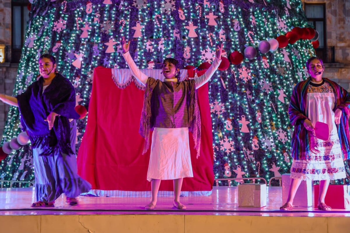 Zacatecas, Zac.- En el marco de la programación artística del Festival de Luces 2025, que el Gobierno del Estado realiza, a través del Instituto Zacatecano de Cultura (IZC) “Ramón López Velarde” y el Sistema Estatal para el Desarrollo Integral de la Familia (SEDIF), tuvo lugar la puesta en escena “Chona, China, Chayo y los diablos suatos”, una divertida pastorela presentada por Alquimia Teatral, en Plaza de Armas.