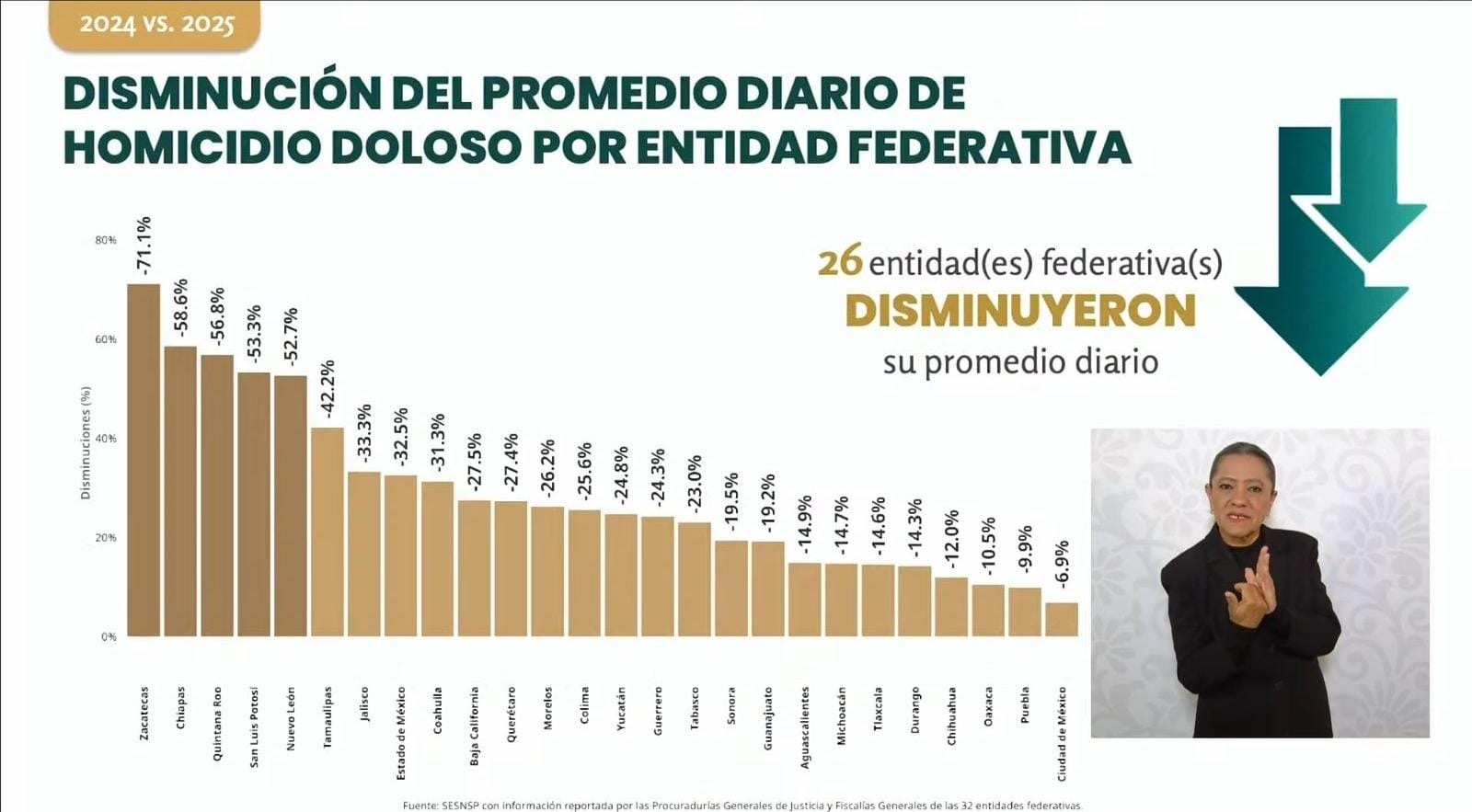 “Zacatecas encabeza el listado de las 26 entidades federativas que lograron disminuir su promedio diario de homicidios dolosos; esta reducción, del 71.1 por ciento, es un resultado contundente que reconoce el trabajo coordinado en la entidad”, informó la SecretariaMarcela Figueroa Franco, al presentar el balance de 2025 con datos provenientes de las 32 Fiscalías estatales del país.
