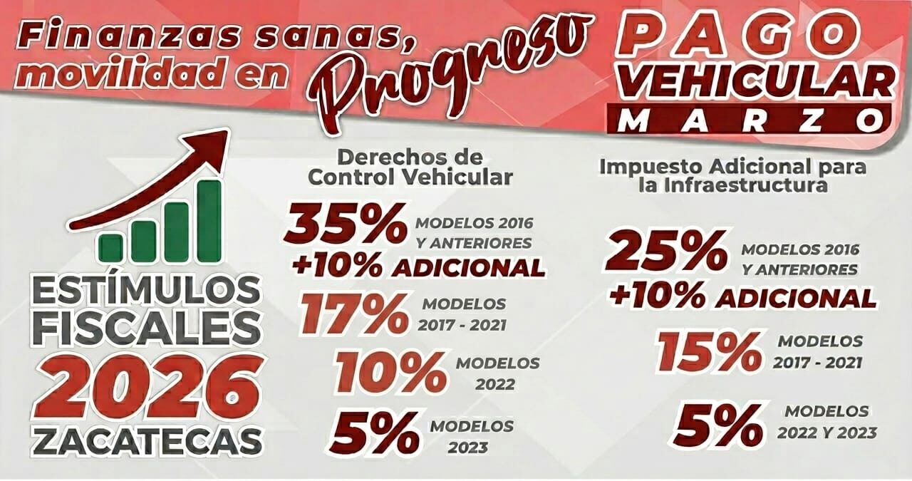 Zacatecas, Zac.- En el marco del 2026, Año del Progreso, el Gobierno de Zacatecas, encabezado por el mandatario estatal David Monreal Ávila, a través de la Secretaría de Finanzas (Sefin), continúa con estímulos fiscales, vigentes durante el mes de marzo, orientados a facilitar el cumplimiento de las obligaciones vehiculares y contribuir al bienestar de las familias zacatecanas.