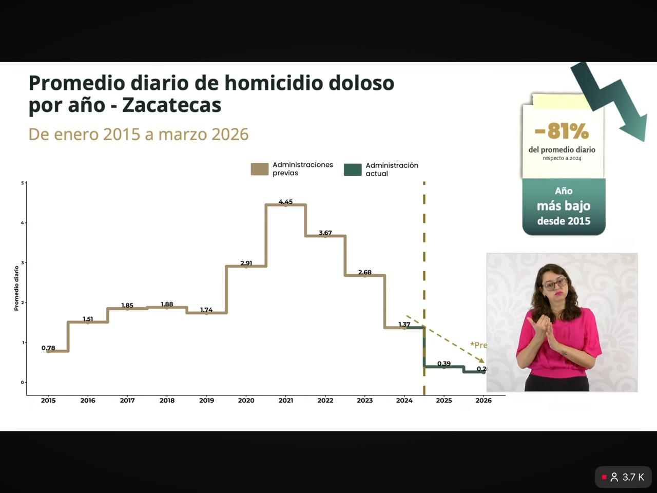 Zacatecas, Zac..- En La Mañanera del Pueblo, encabezada por la Presidenta de México, Claudia Sheinbaum Pardo, el Secretariado Ejecutivo del Sistema Nacional de Seguridad Pública (SESNSP) destacó a Zacatecas con una reducción del 89 por ciento en el promedio diario de homicidios dolosos, en la comparación de noviembre de 2024 con marzo de 2026, al pasar de 1.47 a 0.16 casos por día.