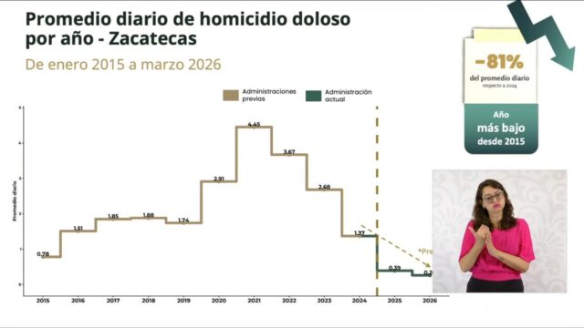 Zacatecas, Zac..- En La Mañanera del Pueblo, encabezada por la Presidenta de México, Claudia Sheinbaum Pardo, el Secretariado Ejecutivo del Sistema Nacional de Seguridad Pública (SESNSP) destacó a Zacatecas con una reducción del 89 por ciento en el promedio diario de homicidios dolosos, en la comparación de noviembre de 2024 con marzo de 2026, al…