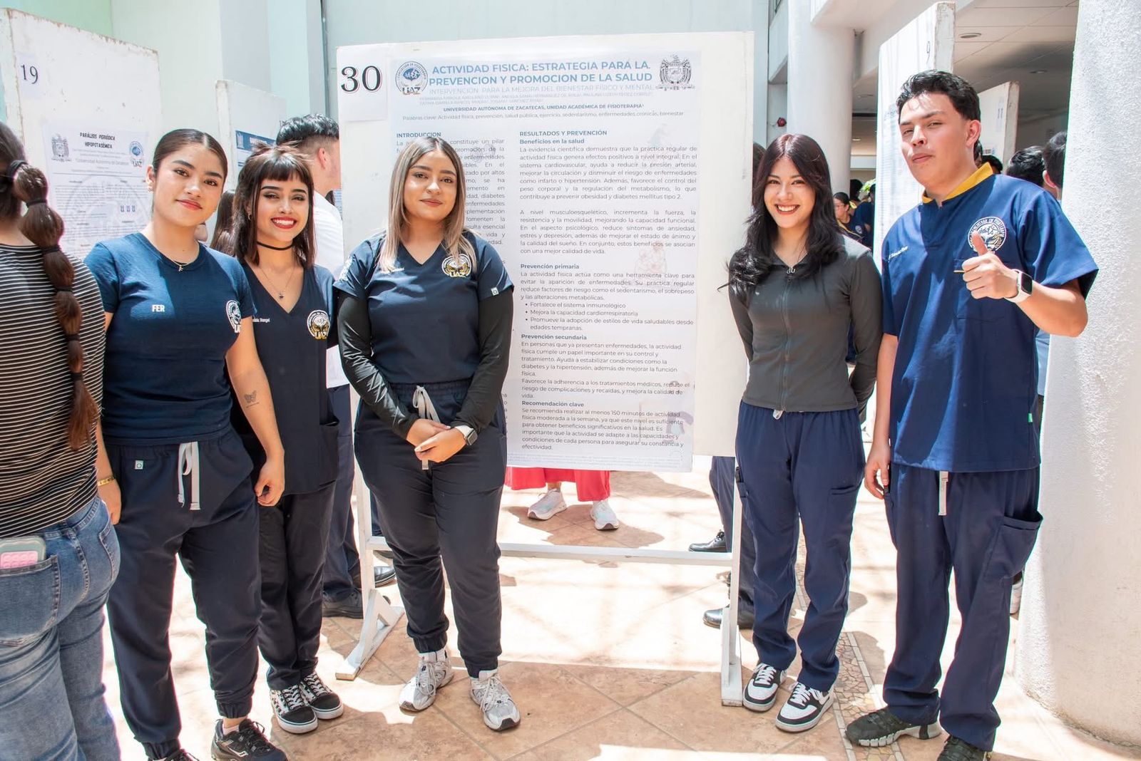 La participación estudiantil fue un componente central de la jornada. Estudiantes de segundo semestre de la Licenciatura en Fisioterapia presentaron carteles científicos, mostrando el desarrollo de habilidades en metodología de la investigación desde las primeras etapas de su formación.