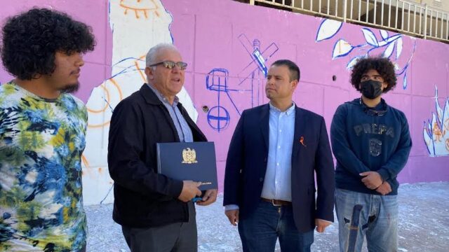 Zacatecas, Zac.-Este día el coordinador del Área de Arte y Cultura de la UAZ, maestro Rodolfo Pinedo García, y el alcalde de Zacatecas, Miguel Varela Pinedo, supervisaron el avance del mural que trabaja el colectivo de artistas urbanos, Ahenes, en la colonia Pánfilo Natera y que forma parte del proyecto “Arte y Cultura, La Calle…