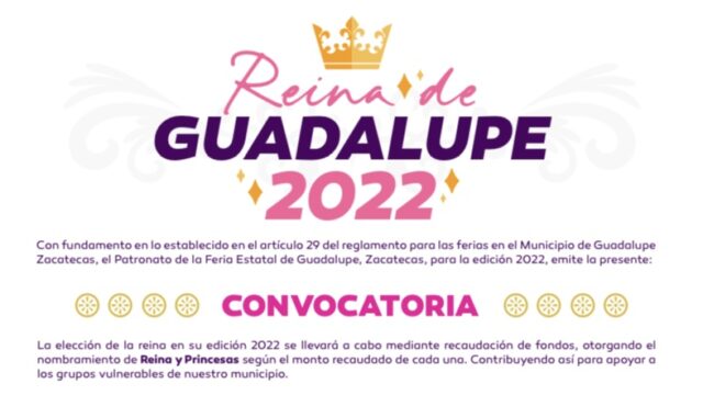Zacatecas, Zac.-De acuerdo a lo establecido en el Artículo 29 del Reglamento para las Ferias del Municipio de Guadalupe, a través del Patronato de la Feria Estatal de Guadalupe, emitió la convocatoria correspondiente a la elección de la reina en su edición 2022, la cual se llevará a cabo mediante recaudación de fondos, otorgando el…