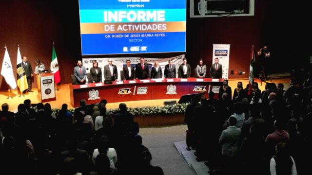 Zacatecas, Zac.- Rubén Ibarra Reyes, rector de la Universidad Autónoma de Zacatecas, presentó este lunes su primer informe de resultados, a un año de gestión al frente de nuestra máxima casa de estudios, ante los integrantes de la presidencia colegiada del Honorable Consejo Universitario, así como directores de escuelas, coordinadores de área y decenas de…