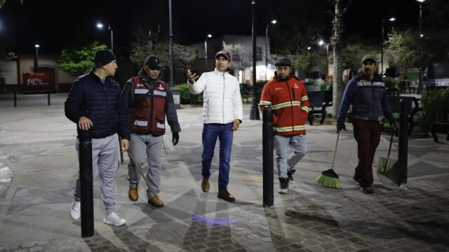 Zacatecas, Zac.- Minutos antes de las 6 de la mañana de este jueves 15 de febrero, el Presidente Municipal de Guadalupe, Zacatecas, Pepe Saldívar, realizó una supervisión de las actividades que personal del Departamento de Barrido Manual, realiza en el Jardín Juárez desde las primeras horas del día. “Desde muy temprano andamos supervisando estas actividades…