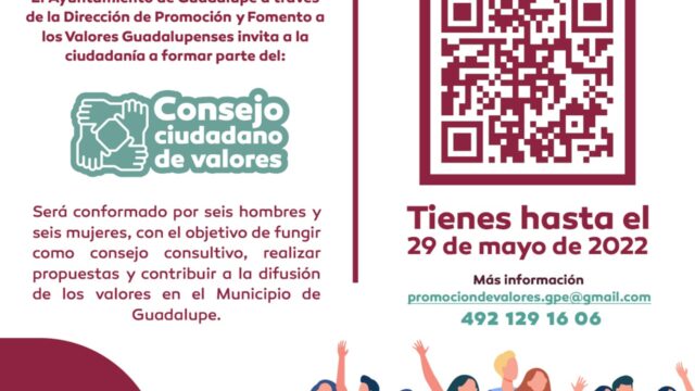 Zacatecas, Zac.- Con el objetivo de realizar propuestas de actividades para la difusión de valores en instituciones educativas, con servidores públicos y la ciudadanía, es que el Ayuntamiento de Guadalupe, que encabeza Julio César Chávez Padilla, a través de la Dirección de Promoción y Fomento a los Valores Guadalupenses, convoca a las y los guadalupenses…