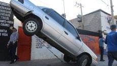 Se sube al soporte de un poste por evitar chocar con otro auto