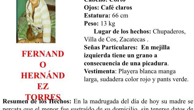 Zacatecas, Zac.- Este jueves, la Procuraduría General de Justicia del Estado de Zacatecas (PGJEZ) activó la Alerta Amber por la desaparición del menor Fernando Hernández Torres, por lo que se requiere la colaboración de la ciudadanía para localizarlo. La madre del menor presentó denuncia por la desaparición de su hijo de dos años de edad…