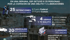 Zacatecas, Zac.- Con el compromiso de desplegar acciones que permitan fortalecer la seguridad y recuperar la tranquilidad de las y los zacatecanos, la Secretaría de Seguridad Pública (SSP) informó que el trabajo de sus corporaciones policiales permitió que, en una semana, se lograra la detención de 25 personas por la comisión de un delito -ocho del…