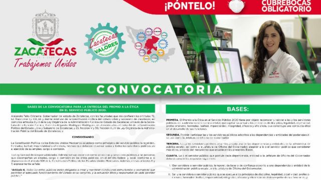 Zacatecas, Zac.- El Gobierno del Estado de Zacatecas lanzó la convocatoria al premio Ética en el Servicio Público 2020, con la finalidad de reconocer y a las y los servidores públicos que en su vida laboral e institucional se hayan conducido con los principios de ética, legalidad, profesionalismo, honradez, integridad, eficacia y eficiencia. El reconocimiento…