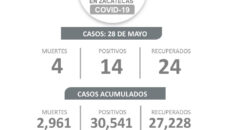 Zacatecas, Zac.- Este viernes, la Secretaría de Salud de Zacatecas (SSZ) reportó el fallecimiento de cuatro personas a causa del COVID-19, 14 más se contagiaron y 24 se recuperaron de la enfermedad. De acuerdo al reporte, desde el inicio de la pandemia, en el Estado se han presentado 30 mil 541 contagios, de los cuales,…