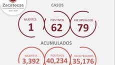 Zacatecas registra hoy 62 nuevos casos de COVID-19, para alcanzar un acumulado de 40 mil 234 confirmados; así como 79 zacatecanos recuperados de la enfermedad y un deceso, de acuerdo al reporte de la Secretaría de Salud de Zacatecas (SSZ). Los 62 nuevos contagios corresponden a 35 hombres y 27 mujeres de entre 8 y…