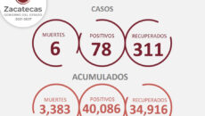 Zacatecas, Zac.-Durante los últimos tres días, Zacatecas registró 311 personas recuperadas del COVID-19, para sumar en total a 34 mil 916 en esta condición; 78 nuevos casos confirmados, con lo cual, esta cifra alcanza los 40 mil 086 durante la pandemia; así como seis fallecimientos por el virus, para un acumulado de 3 mil 383.…