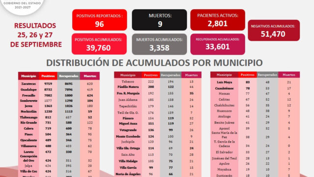 Zacatecas, Zac.- Del 25 al 27 de septiembre, hubo en la entidad 96 nuevos casos de Covid-19, así como nueve muertes provocadas por la enfermedad y 314 personas recuperadas del virus, de acuerdo al informe de la Secretaría de Salud de Zacatecas (SSZ). Entre los nuevos contagios hay una niña de 6 meses de edad,…