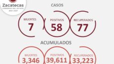 La Secretaría de Salud de Zacatecas (SSZ) reportó este día que 58 zacatecanos más se contagiaron de COVID-19; el virus también causó la muerte de siete personas y 77 más dejaron atrás la enfermedad que éste provoca. Con los 58 nuevos contagios, el acumulado de casos positivos en la entidad, a la fecha, es de…
