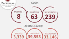 Zacatecas, Zac.-Este miércoles, la Secretaría de Salud de Zacatecas (SSZ) informó que el estado tiene 63 contagios más de COVID-19; así como ocho víctimas fatales y 239 personas recuperadas de la enfermedad. El acumulado de casos positivos, a la fecha, es de 39 mil 553. Hoy son 35 mujeres y 28 hombres, originarios de Fresnillo…