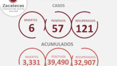 Zacatecas, Zac.- Este día, la Secretaría de Salud de Zacatecas (SSZ) reportó seis fallecimientos y 57 nuevos contagios de COVID-19, así como 121 personas dadas de alta tras superar la enfermedad. De los 57 contagiados, son 28 hombres y 29 mujeres, de entre 5 y 76 años de edad; 20 de ellos radican en Fresnillo,…