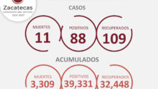 Zacatecas, Zac.- Durante las últimas 48 horas, la entidad registró 11 muertes por COVID-19, para un acumulado de 3 mil 309; así como 88 nuevos contagios, que suman ya 39 mil 243, y 109 recuperados, para un total de 32 mil 448 personas en esta condición. La Secretaría de Salud de Zacatecas (SSZ) informó que…