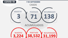 Zacatecas, Zac.-De acuerdo al reporte de la Secretaría de Salud de Zacatecas (SSZ) hoy se registraron 71 nuevos contagios de COVID-19, 138 ya se recuperaron y tres perdieron la vida. Los nuevos contagios corresponden a 38 hombres y 33 mujeres, cuyas edades oscilan entre los 84 y los 2 años; 60 se encuentran en aislamientos…