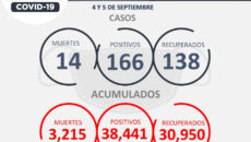 Zacatecas cierra el fin de semana con 14 decesos por COVID-19, acumulando así 3 mil 215 desde el inicio de la pandemia. Además, en 48 horas, la entidad sumó 166 nuevos contagios, de acuerdo al reporte de las autoridades estatales en salud. Al sábado 4 de septiembre corresponden 100 casos nuevos y 66 a este…